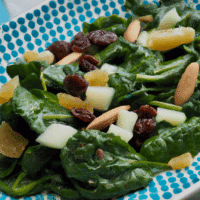Mezcla espinacas frescas con nueces, pasas y un aderezo ligero para una ensalada sabrosa y nutritiva.